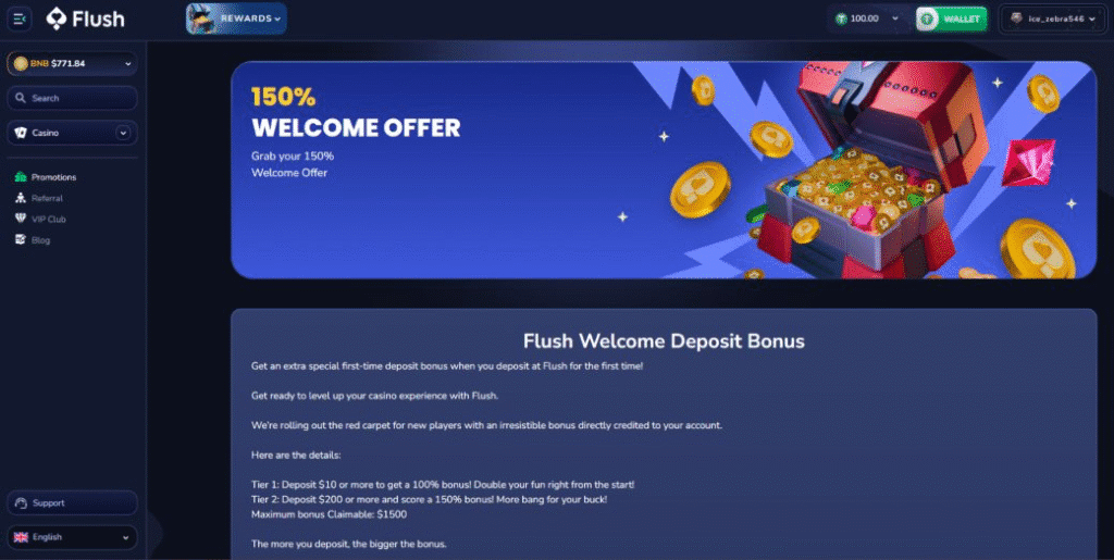 New players could take advantage of a “150% welcome offer” at the time of writing this Flush review. Sounds good, but let’s drill down and see if it stands up to scrutiny.