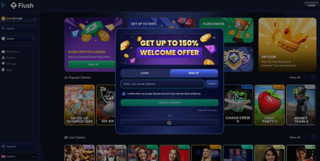 Getting started at Flush crypto casino is quick and easy, with a couple of options available: