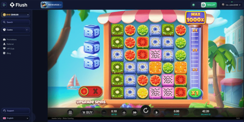 Unwilling to throw more crypto down the drain with Pragmatic Play or NoLimit City, I decided to go for Jumbo Juicy from Relax Gaming. It’s an upbeat beach slot with cluster pays, set on a 6×6 grid, with a max win of up to 10,000x your bet. Importantly, Jumbo Juicy has a volatility rating of medium-high, so hopefully it would deliver more wins, even if they were modest.