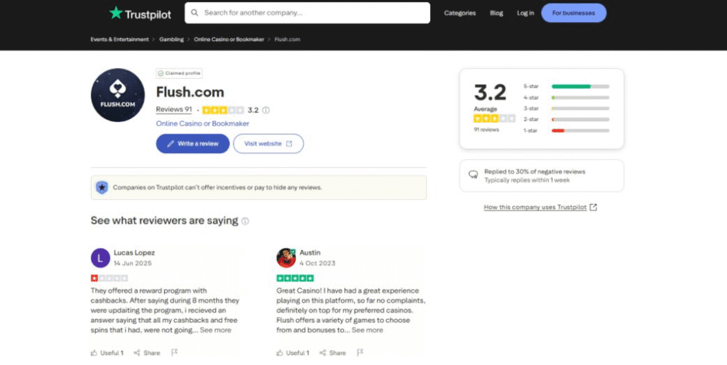 As you can see, the feedback for Flush casino absolutely typical. Glowing reviews from affiliates, and a dramatic split between 5 star and 1 star reviews on Trustpilot. Nothing if not suspicious!