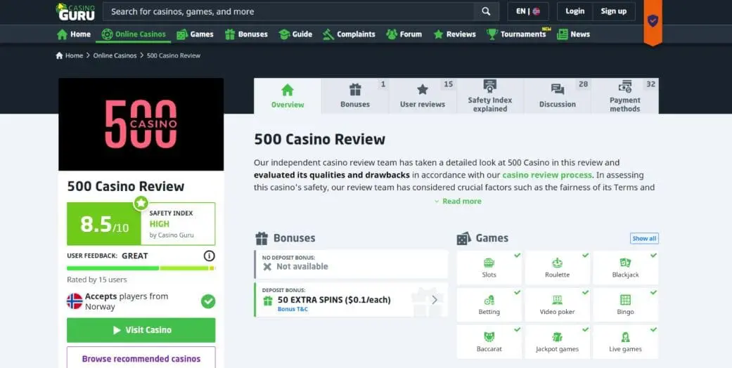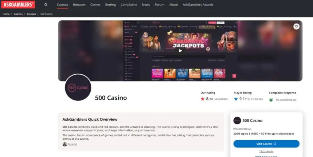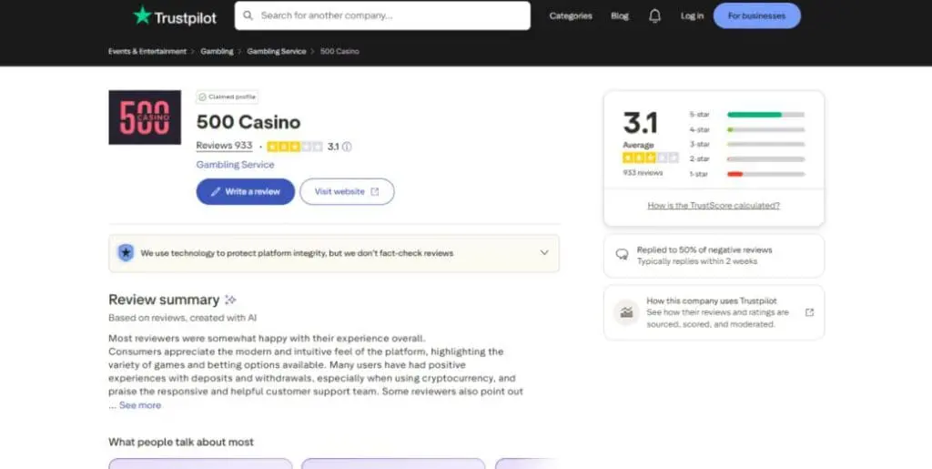 Okay, so I’ve given you an idea of what you can expect from 500 Casino in terms of bonuses, games, payments, and user interface, but what do other people think about this crypto casino? To find out, here are some ratings from popular review sites: