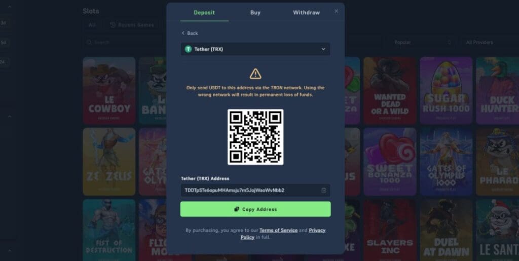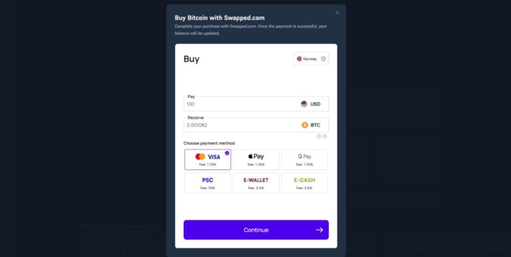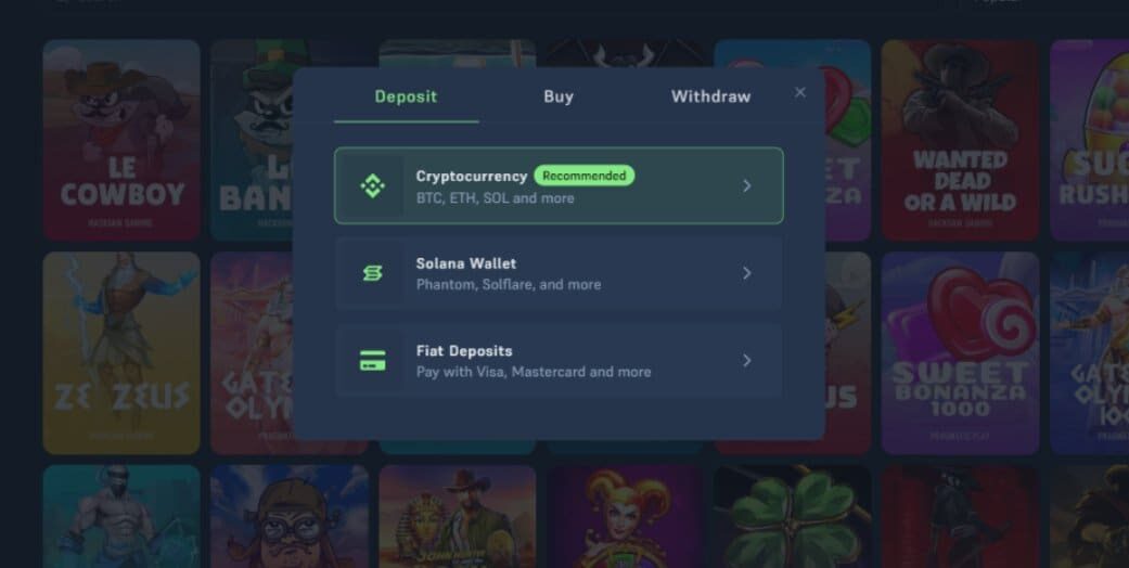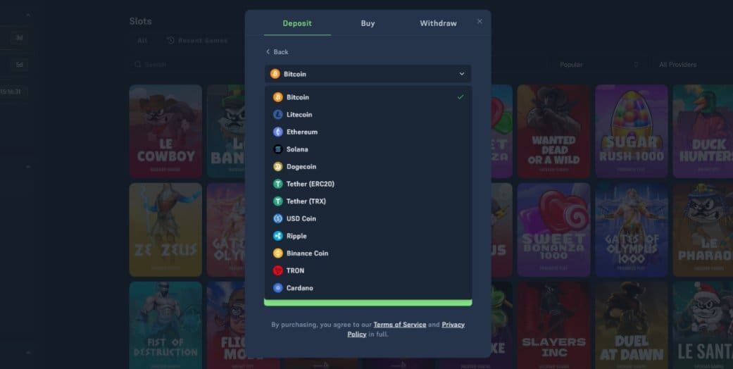 In common with all the best crypto casinos, Acebet allows you to purchase crypto directly on-site via Swapped.com. To do so, simply open your wallet (tap “Deposit”), select “Buy”, and then choose your crypto from the drop-down list. Enter how much you’d like to buy, and follow the prompts.