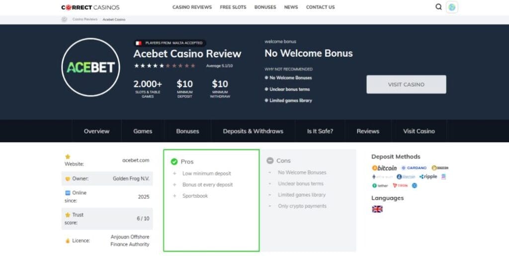 Acebet hit the crypto casino space in 2025 with a generic platform, lacklustre games catalog and lack of information – but is there hope?