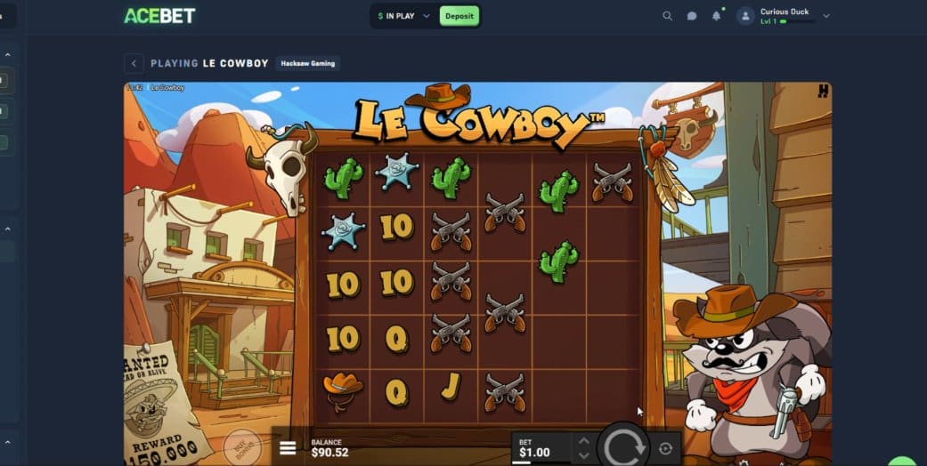 As any CoinBets regular will know, I love Hacksaw slots – both for their playability and visual style. So, I kicked things off at Acebet with Le Cowboy – which sees everyone’s favorite fury Frenchman, Smokey the raccoon, head out west for a bit of gun slinging.