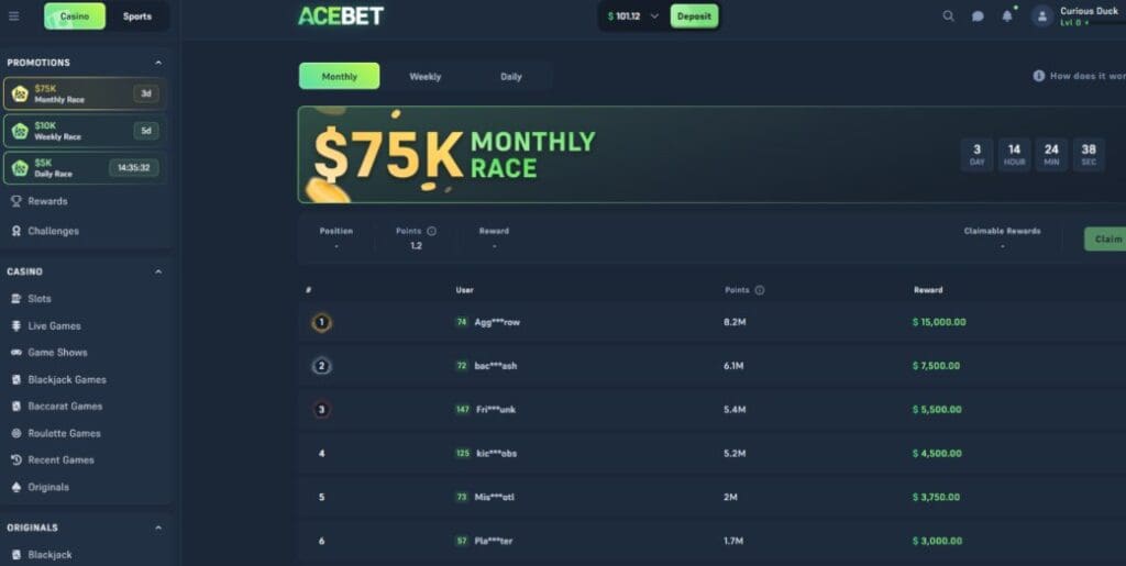 At the time of producing this Acebet casino review, the only promotions running were a trio of wagering races ($75K Monthly, $10K Race, $5K Daily) and some Multiplier Challenges. Not exactly a packed promo calendar there then!