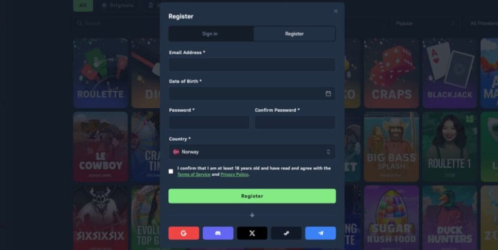 Tap “Register”, enter your email address and date of birth, set a strong password, and choose your country from the drop-down list. Finally, check the box to confirm you’re at least 18 and have read and agree with the Terms of Service and Privacy Policy. Then tap the green “Register” tab.