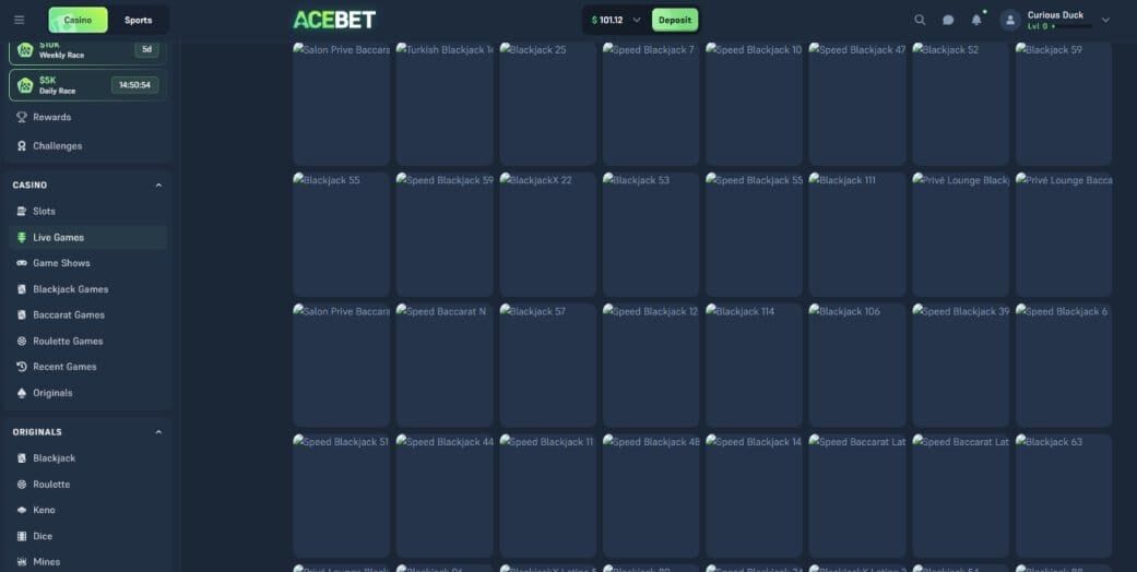 There’s a pretty good choice of live dealer games at Acebet, with options from Evolution, Pragmatic Play Live, Live88, and 155.io. It includes the usual line-up of live blackjack, roulette, baccarat, and craps. However, I would point out that at the time of writing, around half of the games seemed to be unavailable, with missing thumbnails.