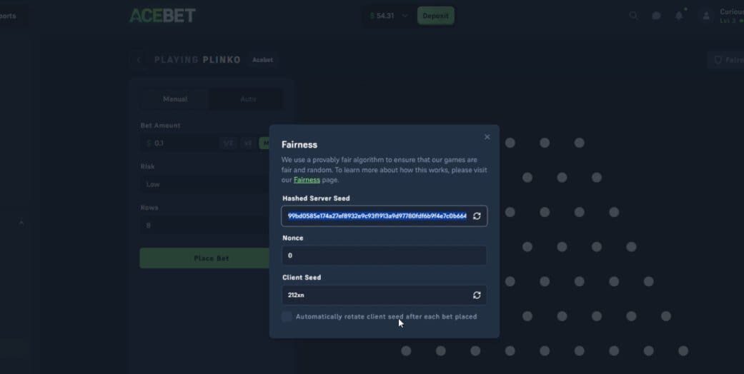 If you’re a regular at CoinBets, you’ll know we like to do a real crypto challenge on a provably fair original game if possible. And here at Acebet, I chose the in-house version of Plinko. However, after taking a hammering on the slots, my bankroll was in a sorry state, so I decided to do a budget challenge with low value bets of just 0.10 USDT each.