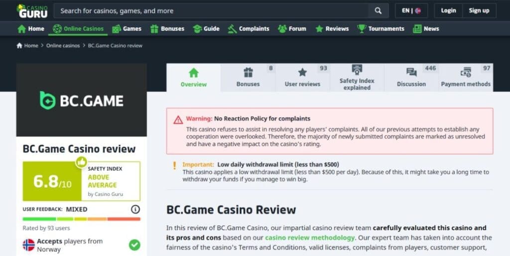 However, a word of warning; according to CasinoGuru, BC.Game has a “no reaction policy for complaints”. That is very troubling.