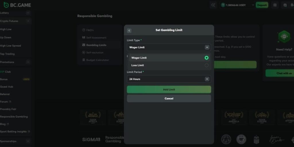 When it comes to responsible gambling, BC.Game has improved since we first reviewed it. As of January 2026, you could set wager limits, loss limits, or self-exclude entirely without needing to contact support.