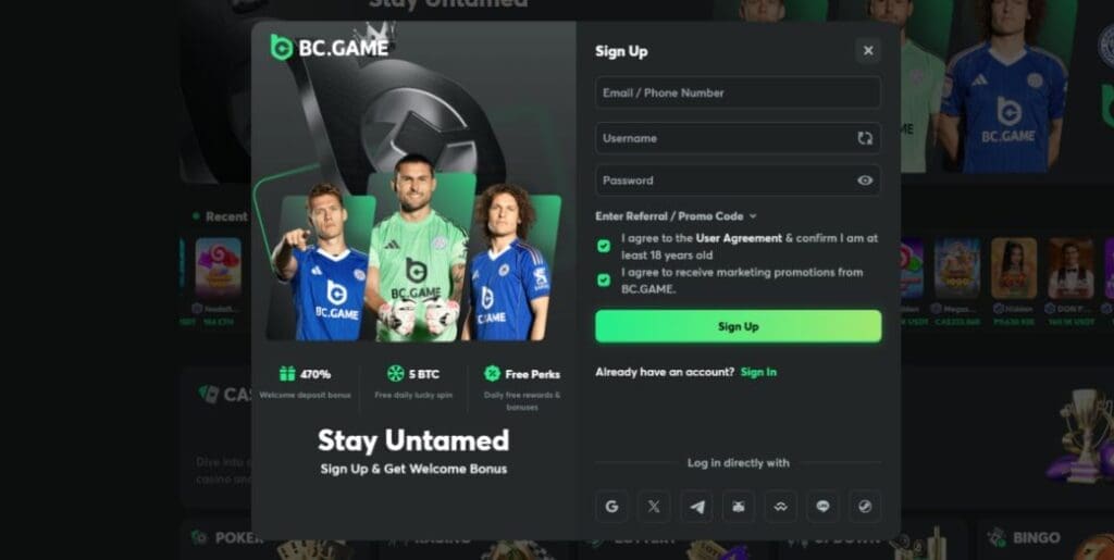 Setting up a new player account at BC.Game is ridiculously easy. There are several options: