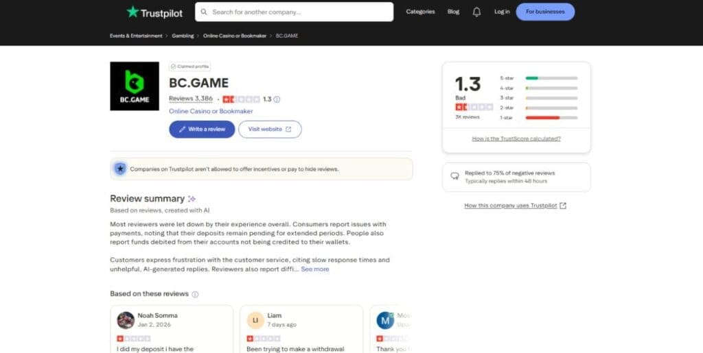 It’s no secret that BC.Game has taken a battering in terms of reputation since it changed ownership. At the time of updating this review in January 2026, these are its ratings at some popular review platforms: