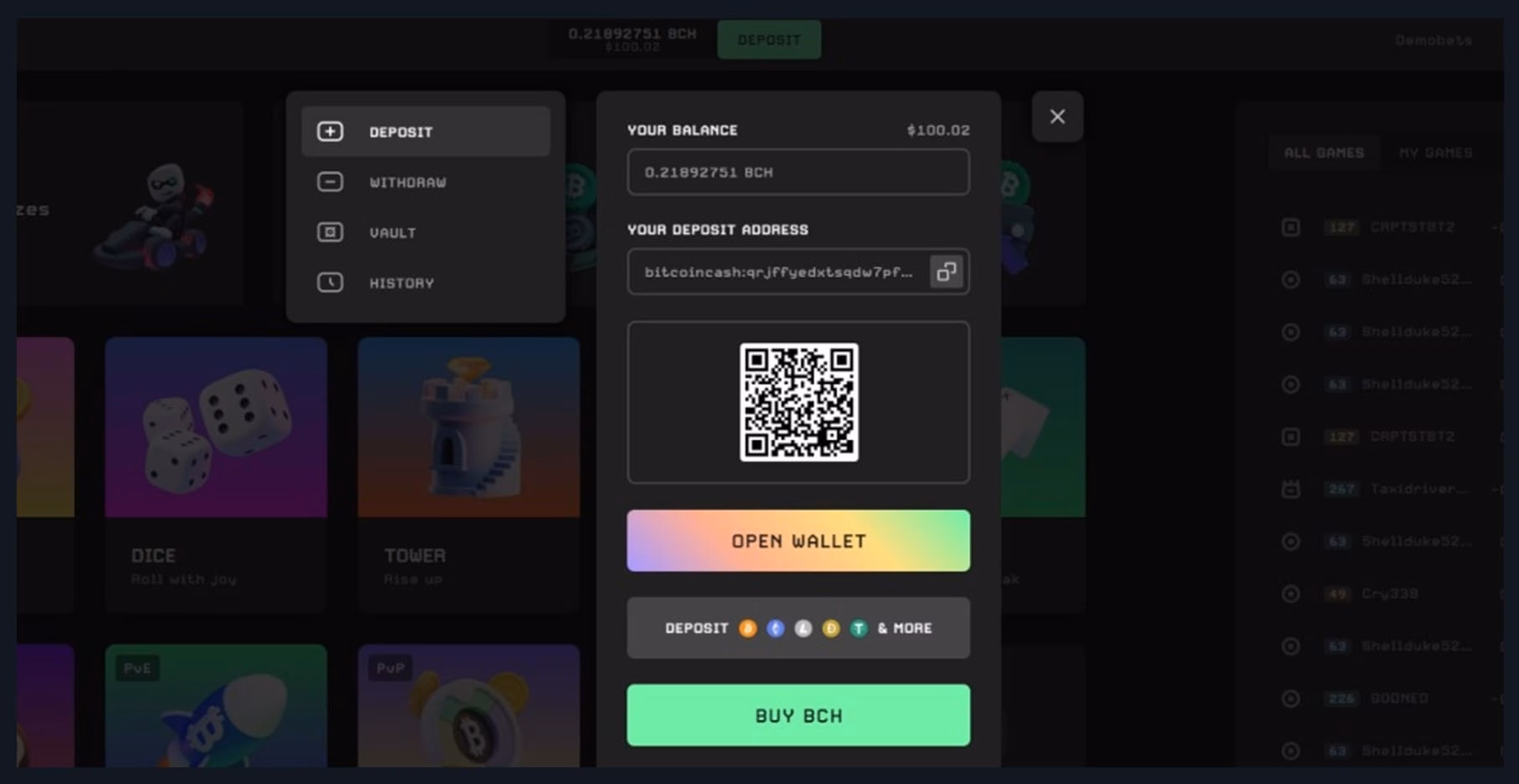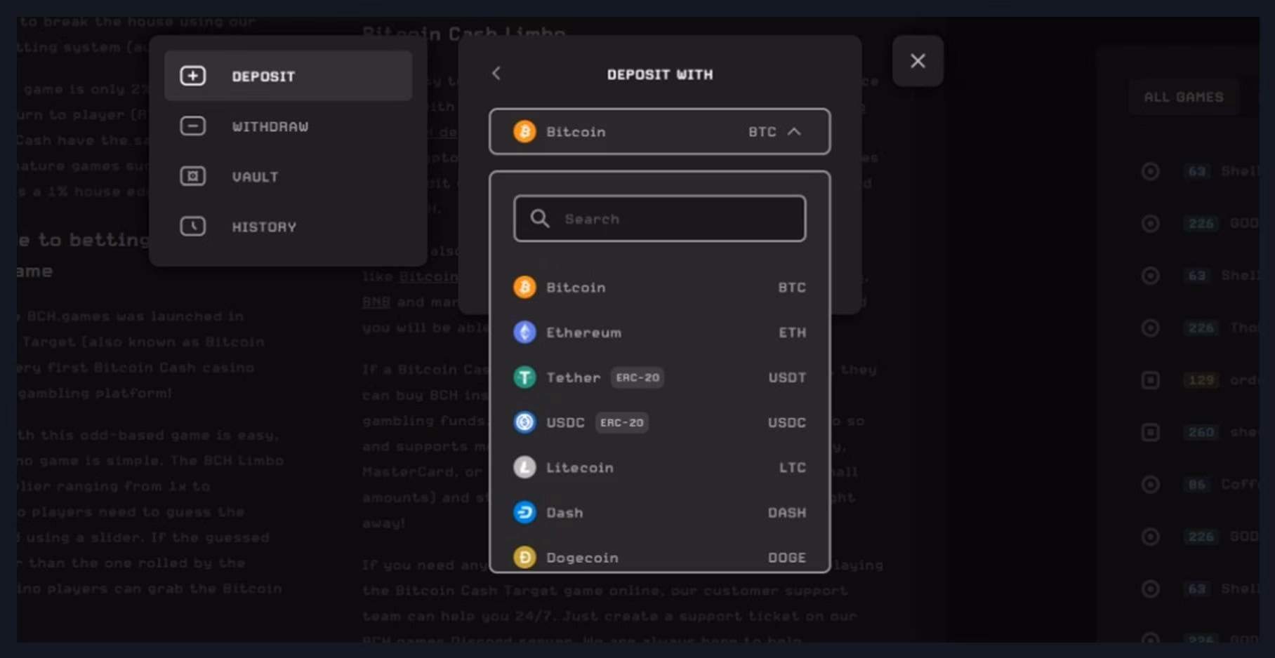 These are just a few of the digital assets you can deposit at BCH.games: