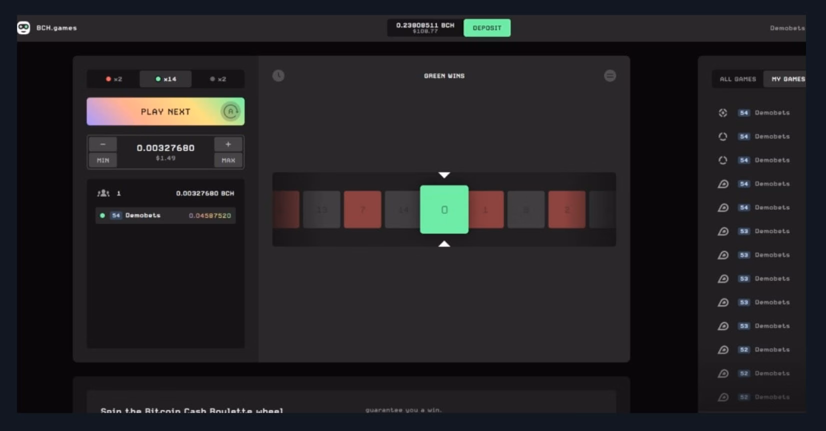 And now for something a little different. in this PvP (player versus player) game, you deposit your BCH into the prize pool. The more you deposit, the bigger the prize pool gets and the higher your chance of winning. I imagine this could be a lot of fun if you were playing against real people – for example, you could hold out until the last moment before bumping up your contribution and chances. Unfortunately, I was playing against the house, which made it too easy to win and gave very low returns. The maximum payout is theoretically unlimited, and the house rake is 5%.