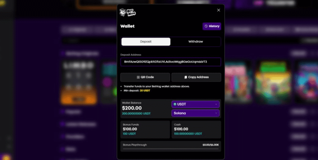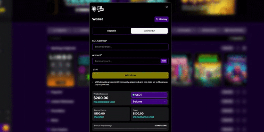 To withdraw crypto, open your wallet and select “Withdraw.” Paste your wallet address and enter the amount you’d like to cash out. If all looks good, tap “Withdraw” to confirm the transaction. Note that at the time of writing this Bethog review, all withdrawal requests were being manually approved – which can take up to 1 business day.