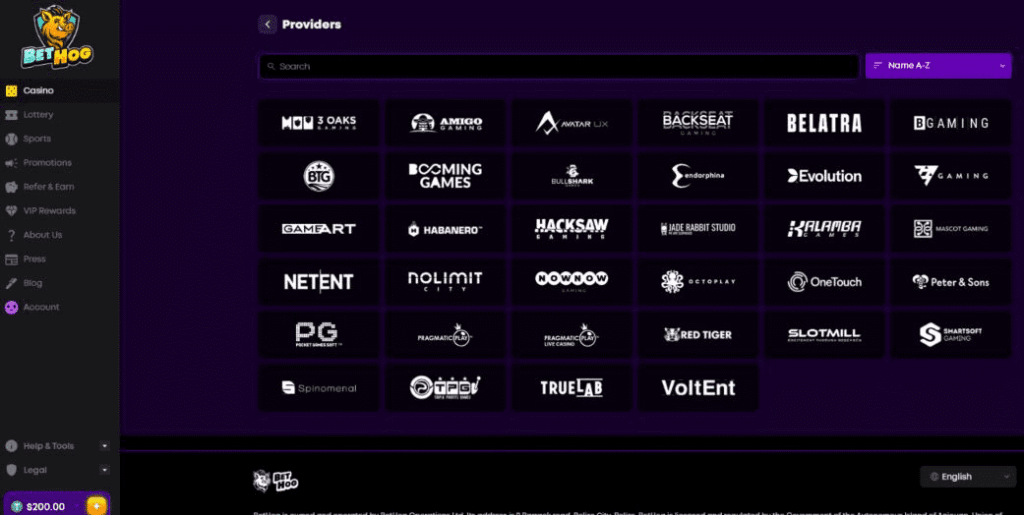 At the time of making this BetHog.com review, the range of games was limited compared to most crypto casinos. The exact number of games wasn’t provided, but with just 34 providers listed, I’d estimate it’s no more than a couple of thousand. And despite the relatively small games catalog, browsing isn’t easy because of a glaring lack of useful categories and filters.