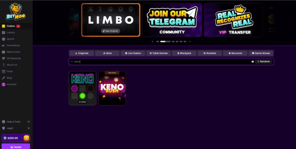A search for “bingo” turned up nothing here at BetHog, while “keno” did slightly better with two games – Keno Rush from One Touch, and a BetHog Original.