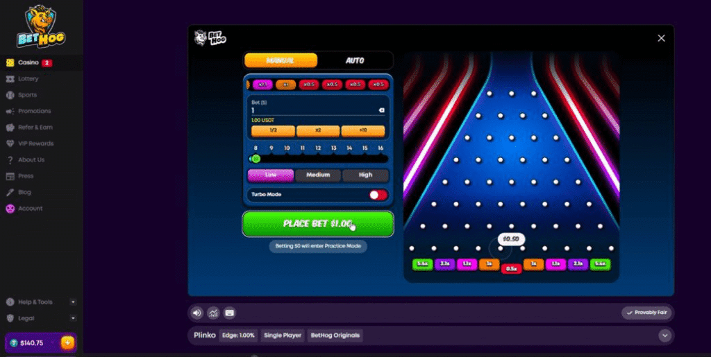 As for BetHog’s in-house Plinko? Well, it’s pretty much like most own-brand plinko games. Perfectly playable, but nothing particularly special about it. The provably fair tools were readily accessible and easy to use though – so kudos to the BetHog team for that.
