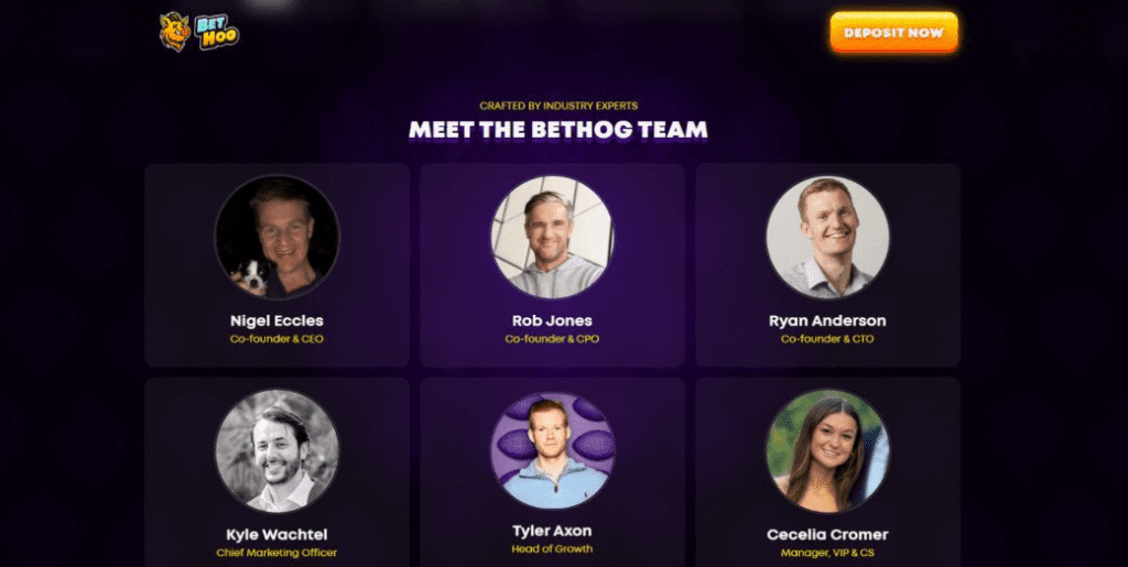 BetHog.com was founded by Nigel Eccles and Rob Jones – both were also co-founders of leading American sportsbook Fanduel.com. Unusually for a crypto casino, all the principal team members (including the social media intern) are named and pictured on the website.