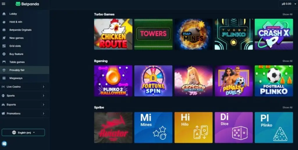 At the time of writing this review, more than 6,000 titles from over 70 game providers were available at the BetPanda crypto casino. There’s a basic search function, and you can also filter games by provider, type, and features including Buy Bonus, Grid Slot, Hold & Win, Jackpot, Megaways, and Provably Fair.