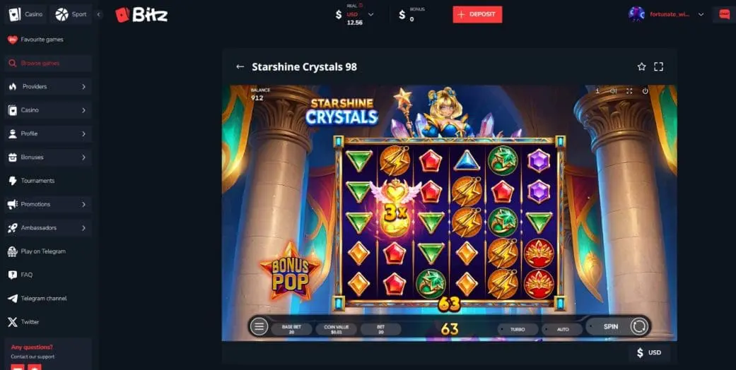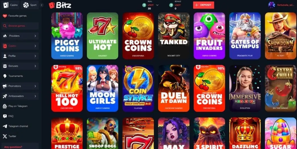 At the time of writing this Bitz casino review, there were over 6,700 casino games of all types from around 60 providers available to play. Overall, things are reasonably well organized, with useful categories like New, Bonus Buy, and Bonus Wagering – though some more granular filters and collections would make browsing easier.