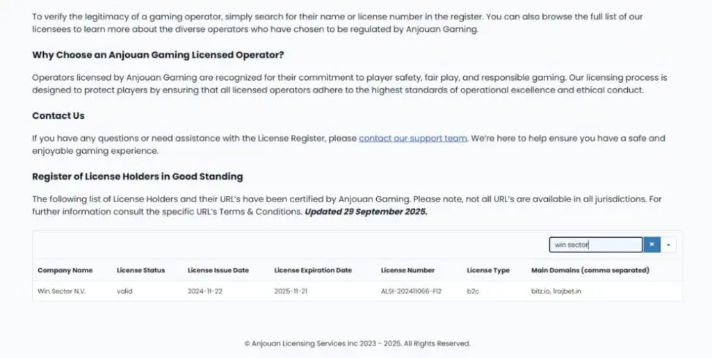 At the time of writing, the official license verification certificate was not displayed in the footer. However, a check on the Anjouan Gaming licence register showed Win Sector did indeed have a valid license.
