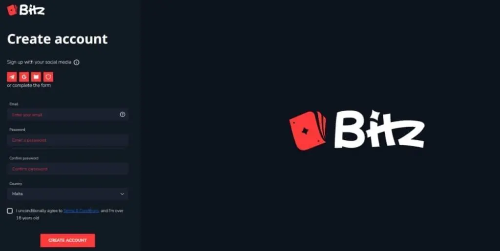 Getting started at Bitz.io casino is quick and easy, with multiple sign-up options available. Just hit the red “Sign Up” tab, and then do one of the following: