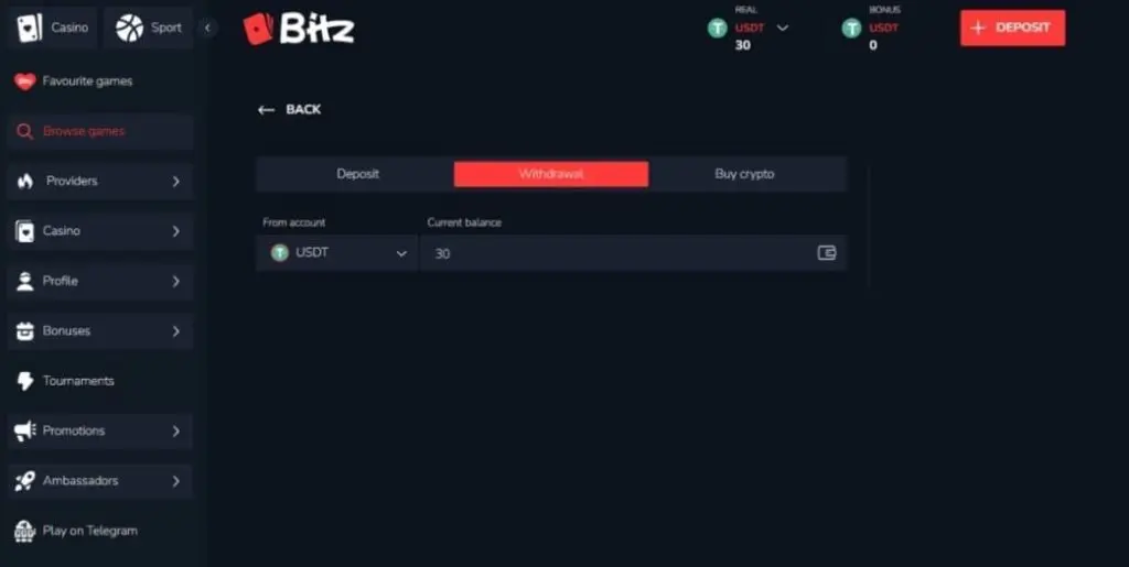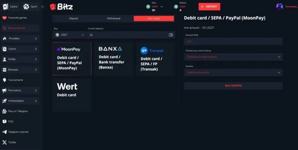 In common with the best crypto casinos, Bitz.io lets you purchase crypto via integrations with third-party platforms. Simply tap “Deposit”, then select “Buy crypto”. Choose a provider like MoonPay, Banxa, Transak, or Wert, enter your payment details, and follow the prompts.