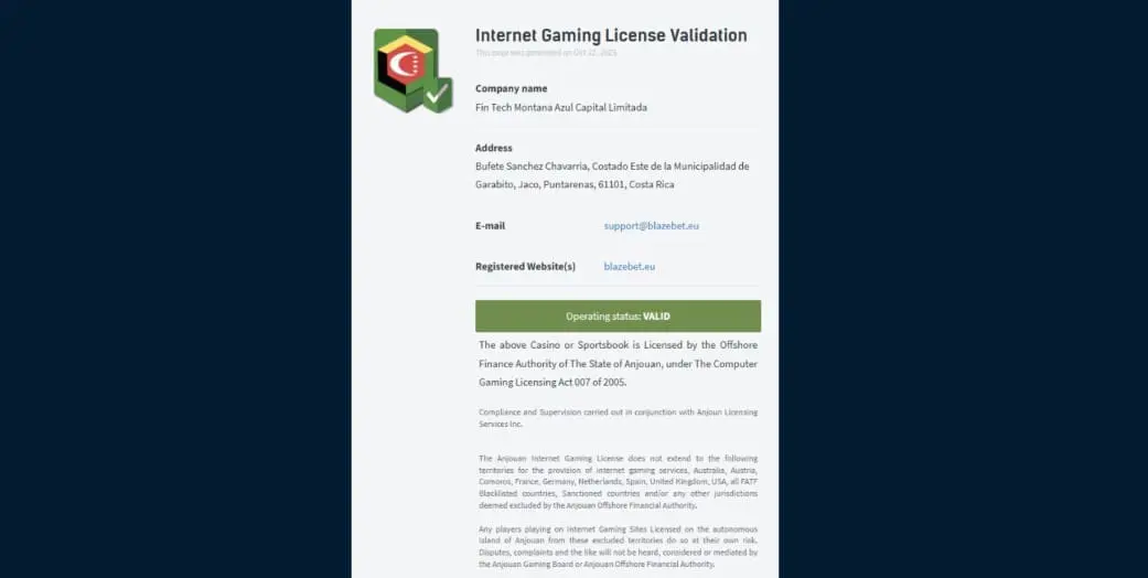 BlazeBet is owned and operated by Fin Tech Montana Azul Capital Ltd., a company registered in Costa Rica (no. 3-102-923802). It is operating under an Anjouan gaming license (ALSI-202504039-F12).