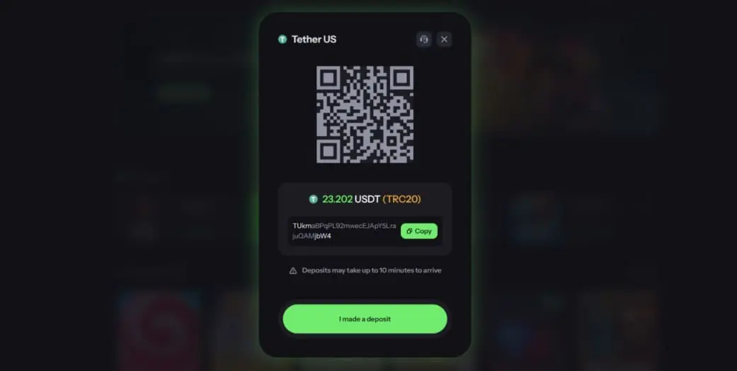 To make a crypto deposit, tap the green “Deposit” tab, select “Cryptocurrency”, and choose the crypto you want to use. Select the network (if applicable), enter how much you want to deposit, and opt-in to a bonus if you want to. Then tap “Deposit” again and you’ll be provided with a unique address in both QR code and text formats.