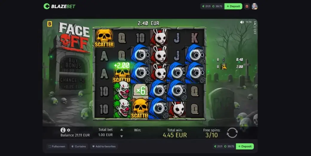 By this time I was well and truly in the Halloween vibe, so I stayed with the creepy and played Face Off from BGaming. Set in a graveyard that’s possibly post-apocalyptic, but definitely contaminated, this slot is a blast.