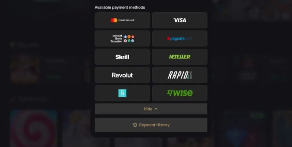 BlazeBet also supports fiat options including Mastercard, Visa, Instant Bank Transfer, Paysafecard, Skrill, Neteller, Revolut, Rapid Transfer, N, and Wise.