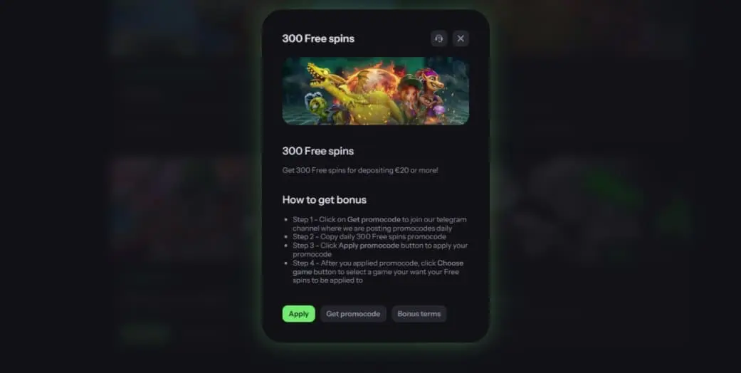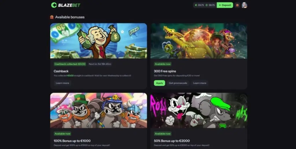 300 Free Spins – Get free spins for depositing €20 or more (promocode from BlazeBet Telegram channel required).