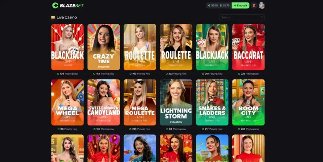 The live dealer lineup at BlazeBet casino is limited to Evolution and Pragmatic Play. That’s not a bad thing, but it would be nice to see more variety. Still, you’ll find plenty of live blackjack, roulette, and baccarat.