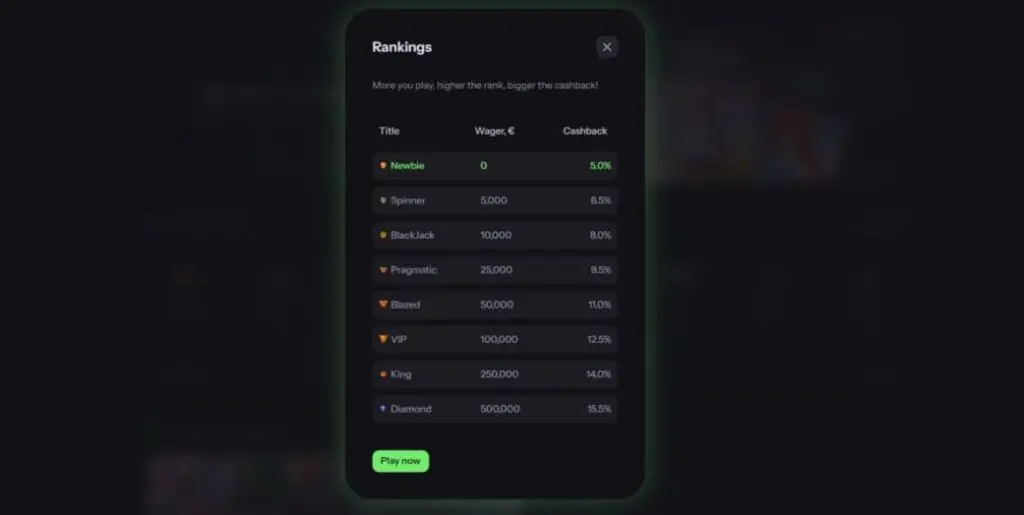 BlazeBet runs a multi-tiered loyalty program, and I have to say, it’s refreshingly simple. Just 8 levels, with cashback rewards – starting at 5% and climbing to 15.5%.