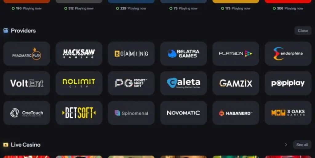 As you’d expect, the vast majority of games are slots. At the time of writing, popular titles included Gates of Olympus Super Scatter and Sugar Rush 1000 from Pragmatic Play, Coin Strike: Hold and Win from Playson, and Hell Hot 100 from Endorphina.