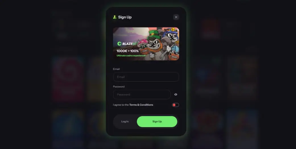 Tap the neon green “Sign Up” tab, enter your email, choose a strong password, agree to the Terms & Conditions, then hit “Sign Up.”