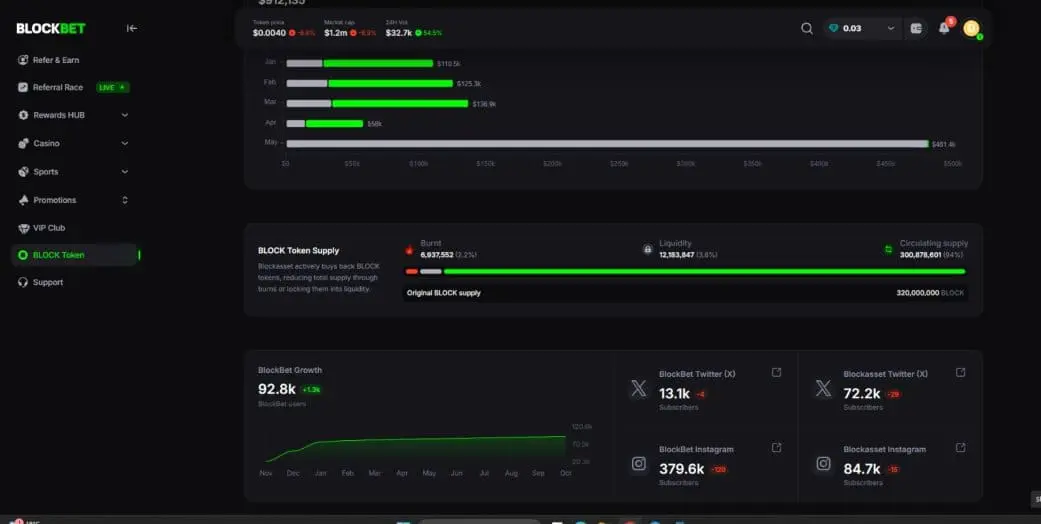 As previously mentioned, Blockbet has a native crypto token called Blockasset (BLOCK). Right, so it’s based on Solana, and at the time of writing, in November 2025, the total supply of BLOCK was 320,000,000, of which 2.2% had been burnt, 3.8% formed liquidity, and 94% was circulating.