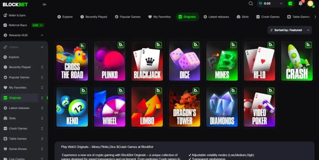 At the time of writing, there were 13 provably fair BlockBet Originals: Cross the Road, Plinko, Blackjack, Dice, Mines, Hi-Lo, Crash, Keno, Wheel, Limbo, Dragon’s Tower, Diamonds, and Video Poker.