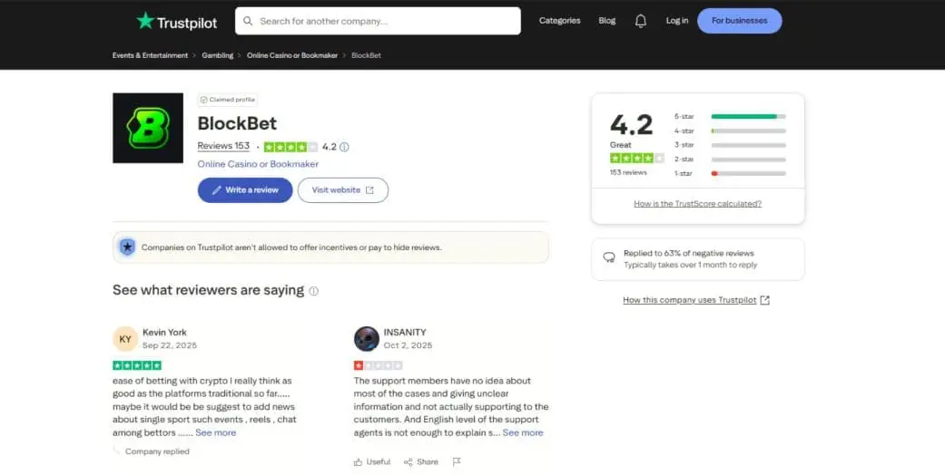 Because it only launched in 2024, it’s hard to gauge BlockBet’s reputation. However, here are some ratings at popular casino review sites: