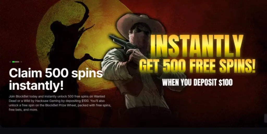 At the time of writing this Blockbet review, the casino was offering a free spins welcome bonus. Specifically, you’ll get 500 free spins on Wanted Dead or a Wild by Hacksaw Gaming for depositing at least $100.