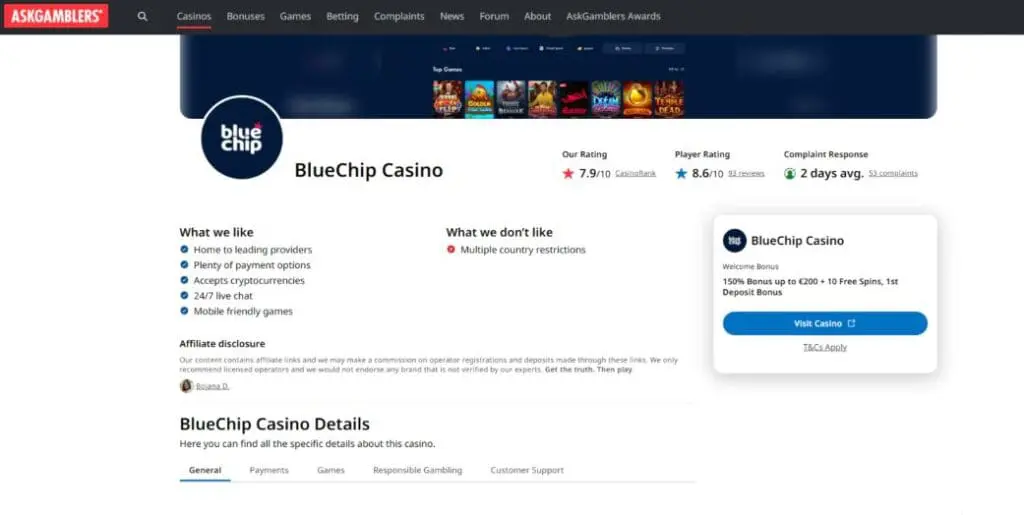 Note in particular that there are allegations that Bluechip , like so many other casinos, has been offering players free spins for leaving good reviews on platforms like Trustpilot. Indeed, the distribution of reviews (split almost evenly between 5-star and 1-star reviews, with hardly any in between) is highly suspicious, and many of the positive reviews do seem less than authentic.