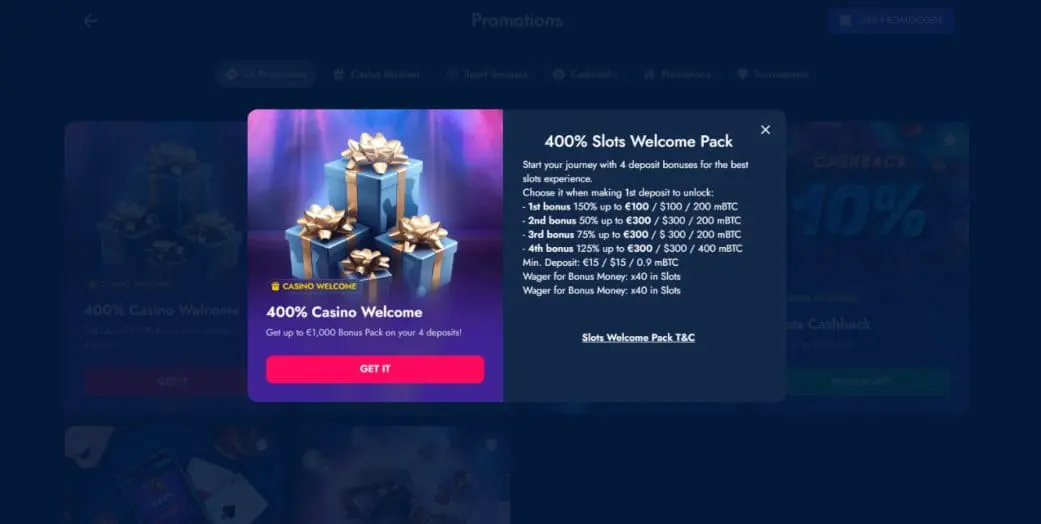 | Bonuses: 100 FS + 5 mBTC/€100 Bonus Money | Bonuses: 150 FS + 10 mBTC/€200 Bonus Money | onuses: 300 FS + 50 mBTC/€1000 Bonus Money |