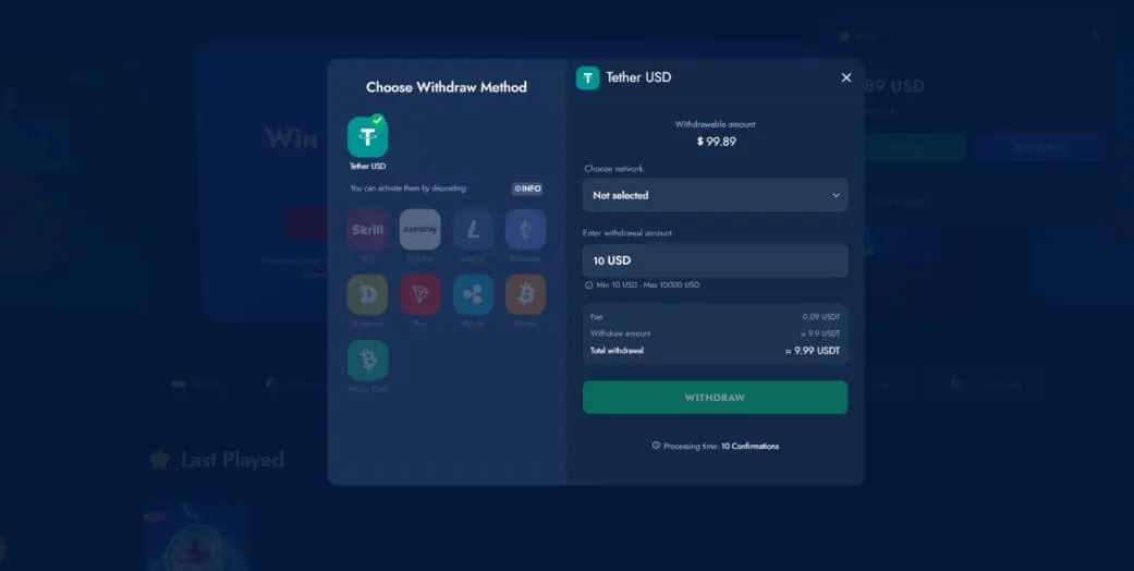 Bluechip casino accepts a modest range of cryptocurrencies for deposits and withdrawals, along with Skrill e-wallets.