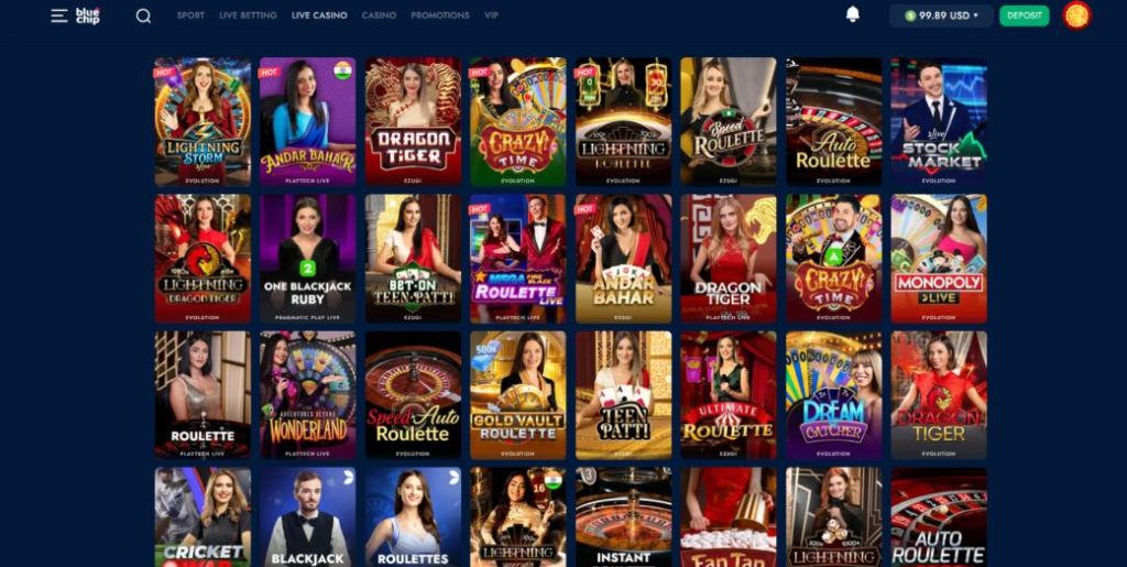 Boasting just over 430 live dealer games, the Bluechip live casino isn’t short on choice. There are useful filters – Game Shows, Live Roulette, Live Baccarat, Live Blackjack, Live Sic Bo, Live Andar Bahar, Live Teen Patti, Other Live Games – but again, they can only be accessed from the main menu.