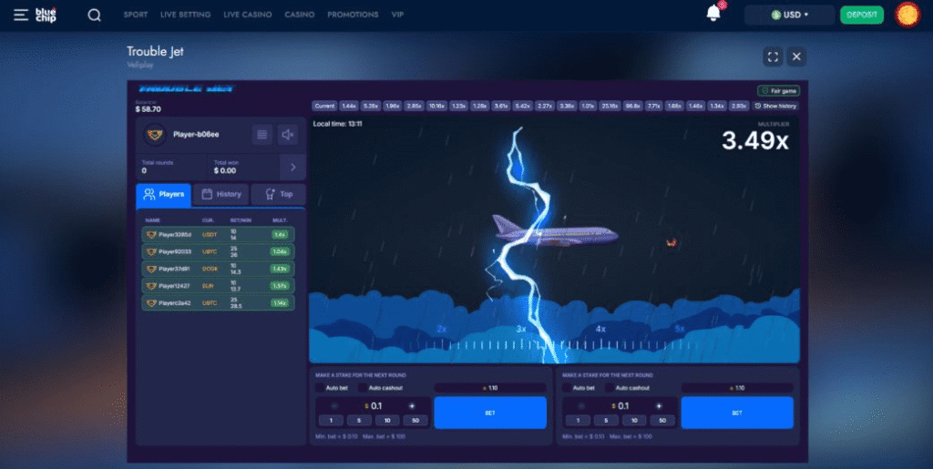 After getting destroyed by the slots here at Bluechip, I decided to opt for a crash game when it came to the CoinBets Challenge. Specifically, Trouble Jet by Veliplay – which is, apparently, exclusive to Bluechip.