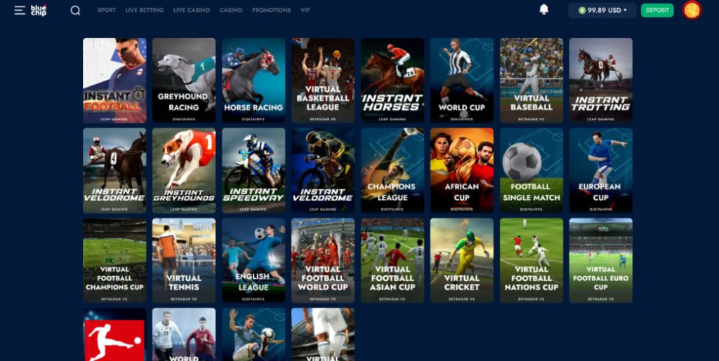 When we first reviewed Bluechip casino, it offered almost 30 virtual sports games from Leap Gaming, Digitain, and BetRadar. Options included Instant Football, Greyhound Racing, Horse Racing, Virtual Basketball League, and Instant Velodrome.