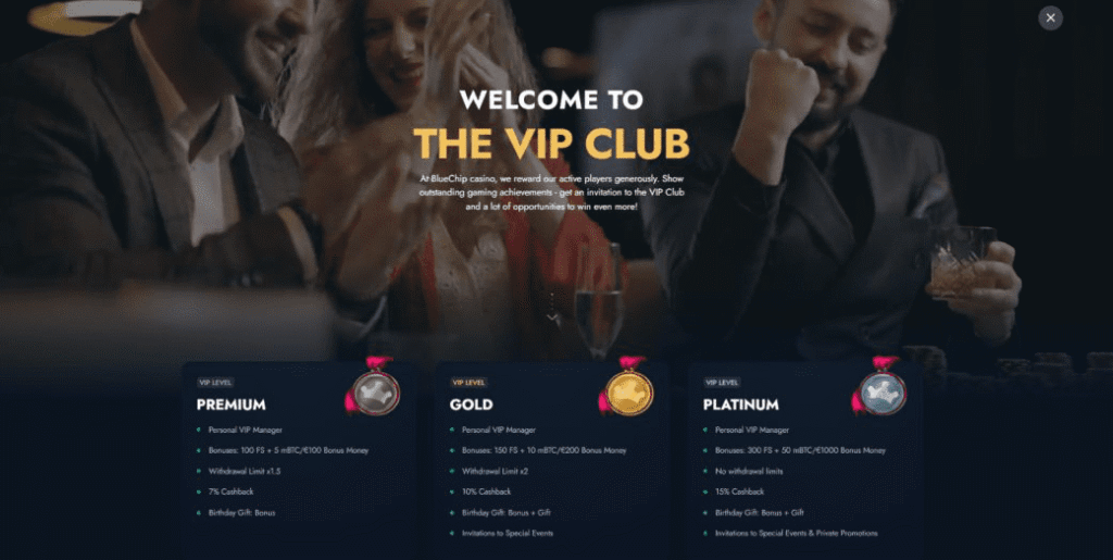 Bluechip casino runs a VIP Club with 3 levels: Premium, Gold, and Platinum. The various perks are as detailed in the table below, but you should note that all VIP cashback is subject to 10x wagering and has a time limit of just 3 days.