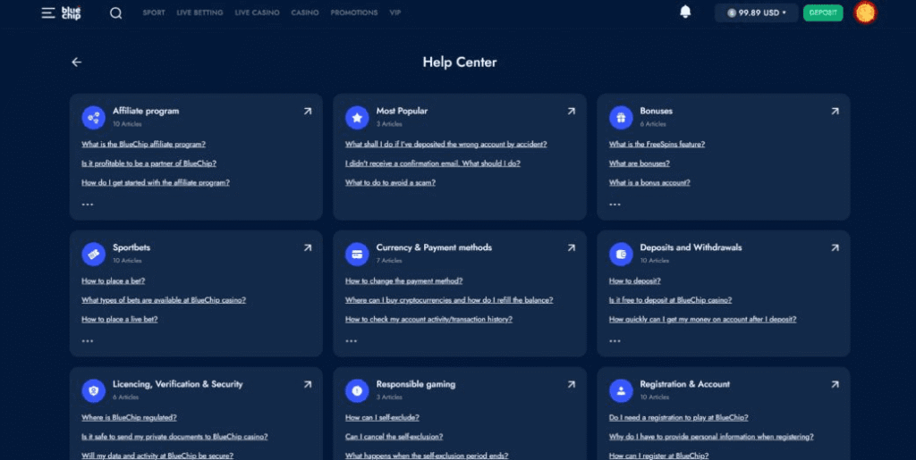 Bluechip casino provides 24/7 player support via live chat and email (support [at] bluechip [dot] io). There’s also a fairly comprehensive Help Center with plenty of useful articles and guides.