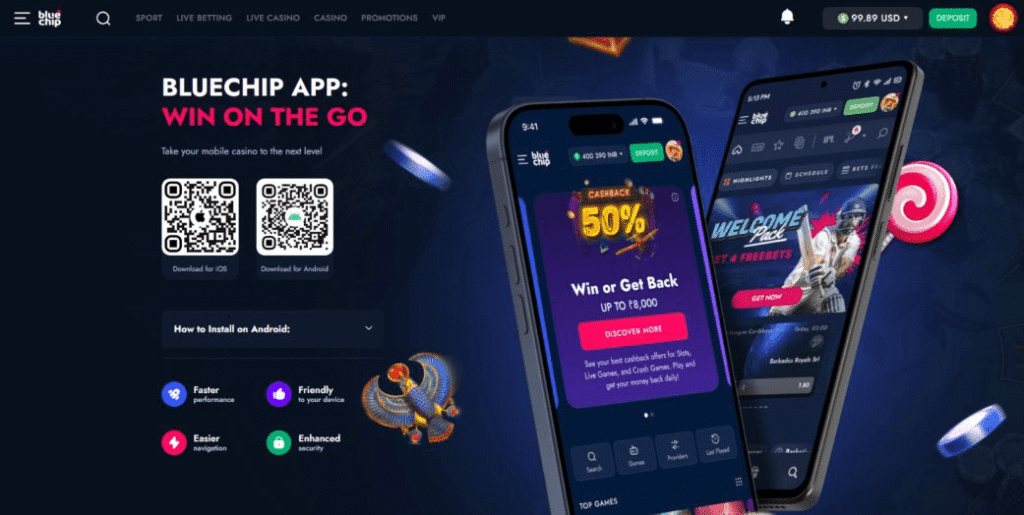 A dedicated Bluechip app is available for Mac OS, Android, and iOS devices. It can be downloaded directly from the website and is promoted as offering faster performance, easier navigation, and enhanced security.